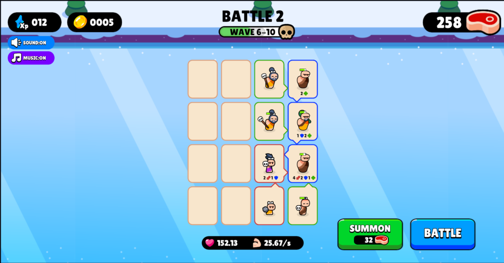 Once you are happy with your team, or you run out of meat (the currency of the game), then you can click on battle and see your team clash against a group of NPCs. The fight is straightforward; the AI is sometimes weird (like the healer keeps running to the front of the line), but a battle usually lasts less than 30 seconds. Once the battle is over, any remaining surviving unit will return to the grid. Any damaged unit can be healed by upgrading it with a unit of the same tier. Note that when you are dragging a unit to use as an upgrade to a target unit, the direction buff of the upgraded unit will be the same as the target unit, not the source. Knowing this, you can plan accordingly so your team members are buffing the correct unit.
