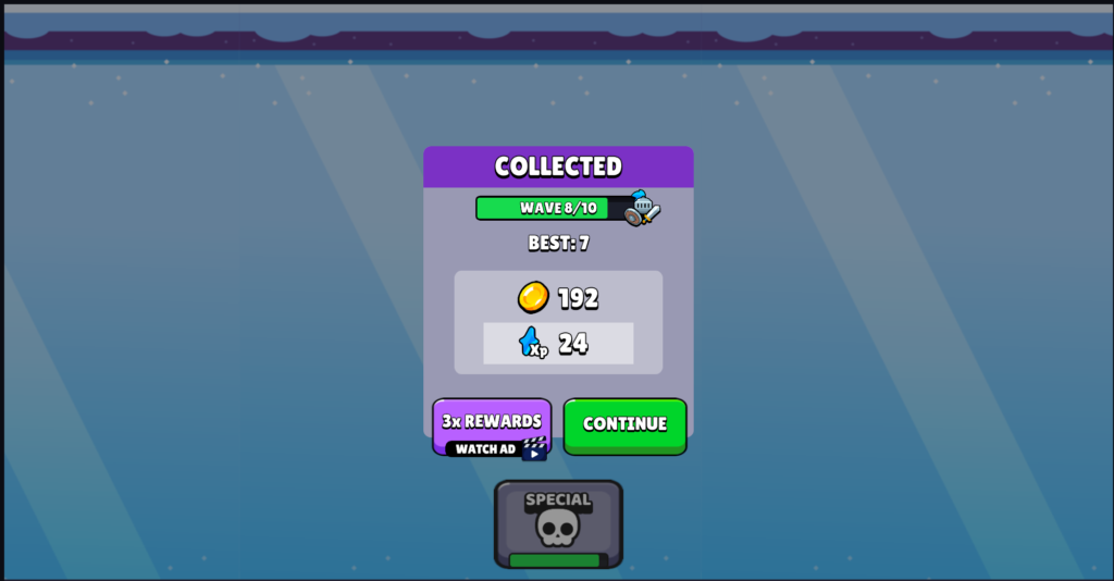 You repeat this process and try to get as far as you can through the wave/level, and as I said before, it gets increasingly unfair. At first I thought I played it the wrong way, but it turns out you are expected to lose because the game has some kind of prestige system. Every time you lose a run, you will get coins and XP, two meta-progression currencies that you can use to power up for the next run.