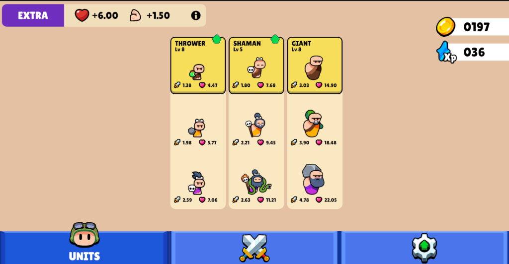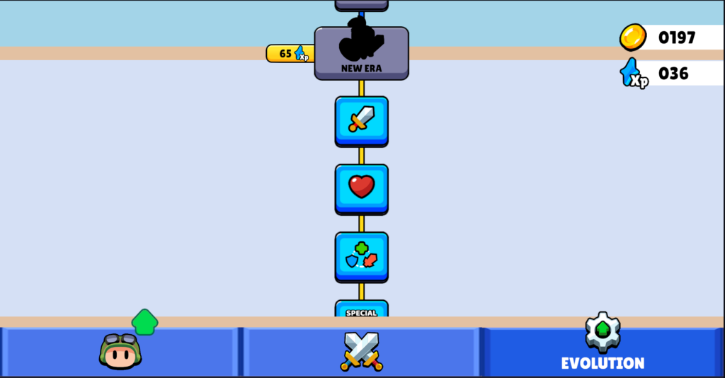 Once you lose all your units, you will be thrown back to the main menu, where you can upgrade your unit or buy an evolution upgrade. Upgrading a unit requires coins, while upgrading evolution requires XP. As you go up the evolution upgrade tree, eventually you can progress to the next age, and I’m assuming your unit will be upgraded automatically.